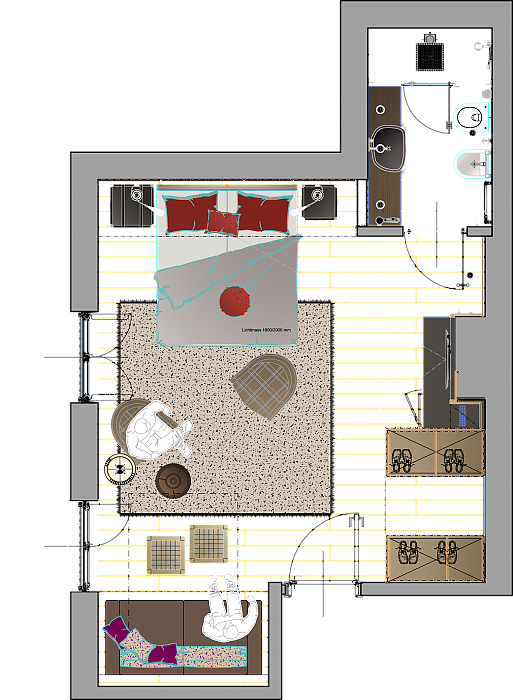 Großzugiges Monolokal mit bequemen Schlafsofa im Wohnbereich und begehbaren Kleiderschrank.